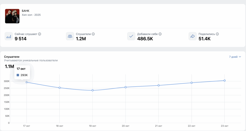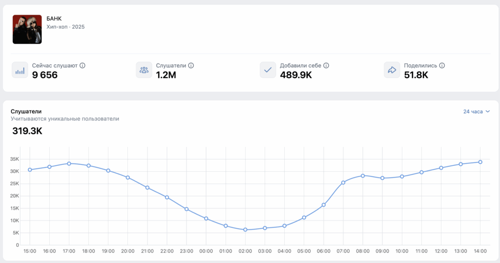 За последние сутки на момент написания данной статьи 319к слушателей, почти каждый третий добавляет песню к себе в аудио после прослушивания, на таких обьемах это говорит о том, что трек — хит!