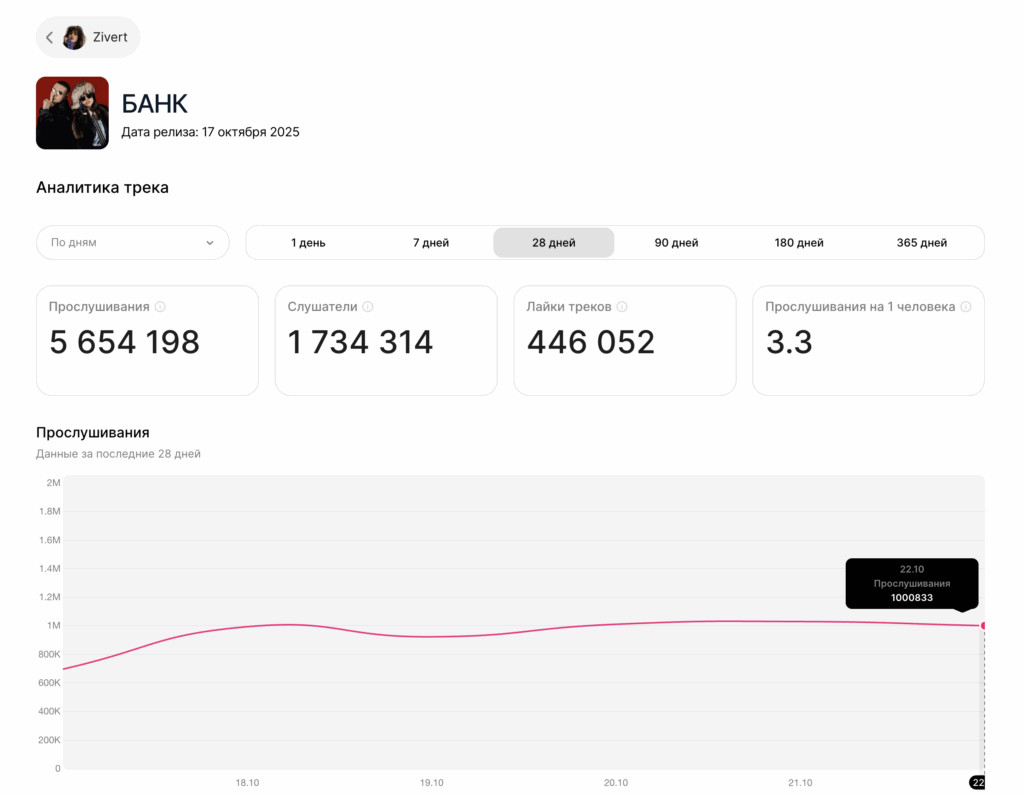Более 1 млн прослушиваний, для того чтобы занимать вторую строчку чарта, но это временно, по всем прогнозам трек должен зайти на первое место. Самый ключевой показатель это «Прослушивания на 1 человека», этот трек люди переслушивают в среднем 3 раза и мы очень редко встречали такие цифры, это поддержает то, что трек — ХИТ!